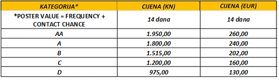 • Cijena promjene plakata u okviru redovitih termina iznosi 112,50 kn (15 Eur) neto po jednoj plakatnoj površini.